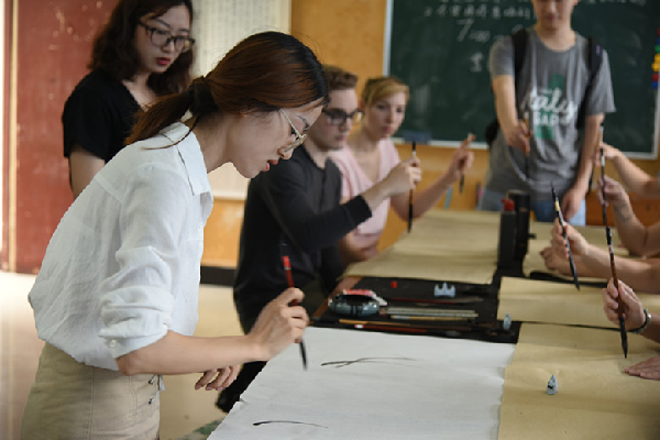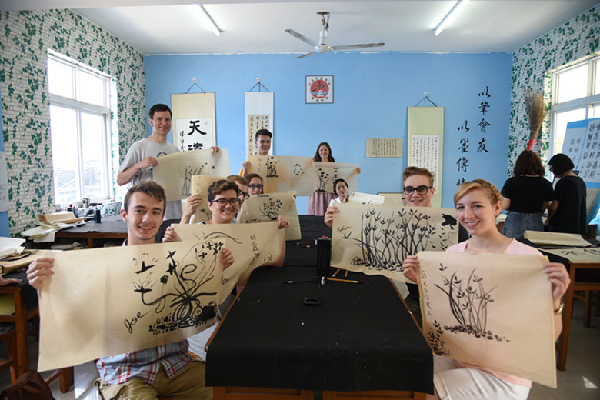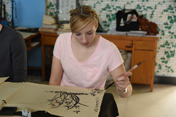 长桌宣纸,笔墨纸砚,线描勾勒,9朵带着异国风情的兰花盛放在宣纸上;大篆小篆,隶书楷书,一撇一捺,雄健洒脱的汉字在宣纸上舒展开来。5月23日上午,来自美国爱荷华州大学的9名大学生在校书法协会同学们的带领下上了一堂有趣的书画课,畅快地体验了一回中国味。